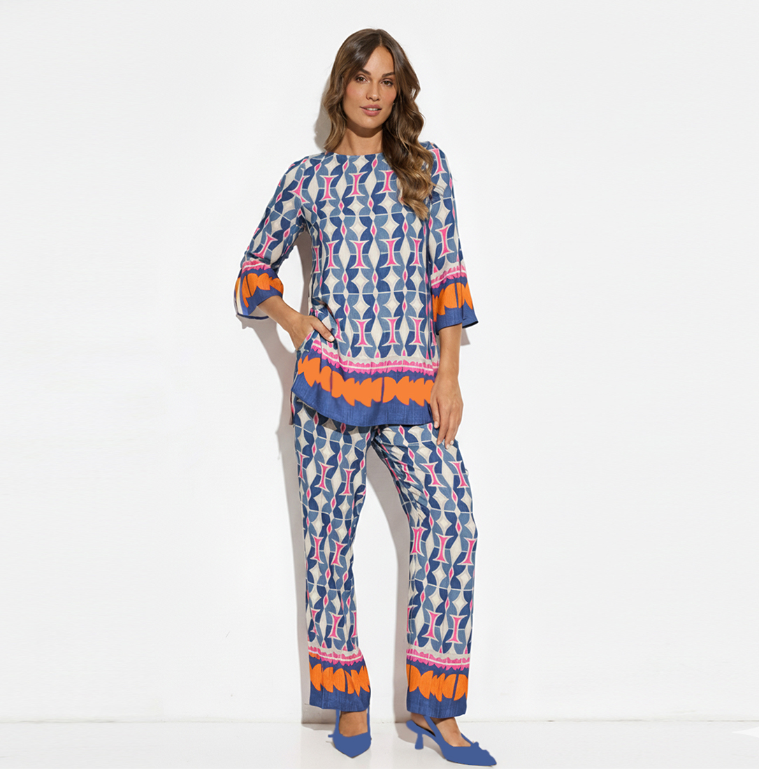 Blusa CHANEL estampada cenefa con manga al codo y aberturas